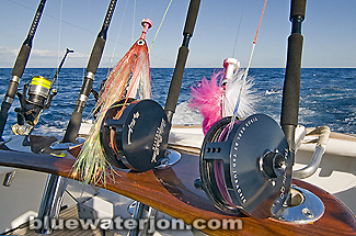 Billfishing in Guatemala is a very visual sport. Fish are raised by a spread of artificial teasers and ballyhoos, and once spotted by the captain from his perch (Left Teaser! Right Outrigger!) the mates draw the fish closer to the boat by reeling in the lures.