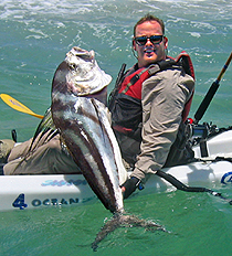 Without a doubt, roosterfish are in a class of their own. Their intricate array of feathered dorsal fins give them an unparalleled exotic look, and their proximity to shore puts the kayak angler in a perfect position target them. At times they roam alone, but just as often they swim in marauding packs with their feathers just above the water’s surface, darting around in waist deep water in search of schools of mullet, their favorite prey. No need to paddle out several hundred yards; these prized fish can be targeted within a stone’s throw of the beach, or less.