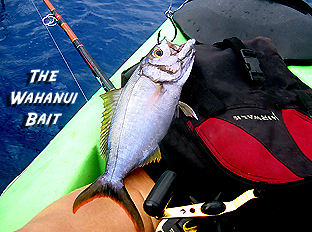 And so began the first real journey of my trip. I got into my kayak, taking my portable fish finder and small tackle box with me, and began paddling around. I figured there must be something wrong with my depth finder because I wasn’t even getting a reading. It wasn’t until I got within a three hundred yards of shore that I started registering some numbers… 598… 590…595…big numbers for being so close to land! This intimidated me so I paddled closer, in the hopes of coming into some more “modest” depth numbers, but even at 50 yards from shore, my fish finder was registering an incredible 300 feet deep! I got out a special knife jig that can reach the bottom quickly. Using this, I caught a small fish, called a Wahanui. I had planned on using artificial baits so as to not attract sharks, but this fish was just too good of a baitfish to pass up, so I took out some special knottable wire, quickly fashioned a leader with a circle hook, put 8 ounces of lead above the swivel, and dropped Mr. Wahanui down to see what would happen.