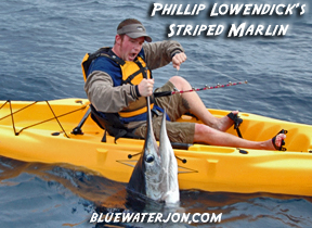 They had plenty of live bait to choose from, and even though I pitched my lifeless bait right next to them, they would have none of it! I radioed back to the boat “Guys! Get over here now! Marlin all over! Hurry up!” but it turns out that tons of marlin had erupted next to them as well and they had decided to take a break from kayak fishing and fight a couple from the boat. I sat there alone in disbelief as the display went on for another five minutes, and when the frenzy abated, made my way back to the boat about ½ a mile away.