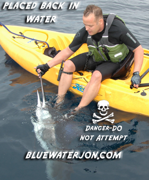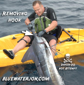 The three marlins were all evidently pulling us kayakers in different directions, and the boat stayed with me because it seemed I might land mine first. After another classic sleigh ride and some more awesome aerial antics, the fish and I slugged it out in a vertical battle, and I got him to leader. This marlin was more exhausted than the first, and knew I had to work to revive him, so I pulled him up to me to remove the hook from his mouth, and then gently placed him back in the water.
