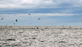 Not long after Captain Juan announced we were “on the grounds”, we saw birds diving on a mass of bait. Phillip and I launched the kayaks and began to paddle around in hopes of hooking up with the predators that were driving the bait to the surface, but it wasn’t as easy as plopping the kayaks in the water and waiting for a hookup. The mass of bait with diving birds was a fast moving entity, which we quickly realized upon entering the water. In less than a minute, the swirling bait ball, which reacted to the submarine strikes from its attackers by shuddering and undulating in spasmodic waves, had moved hundreds of yards from us. There was no way we were going to be able to catch up, so we decided to slow troll around the area with mackerel in tow, hoping to get a blind strike from a passing fish.